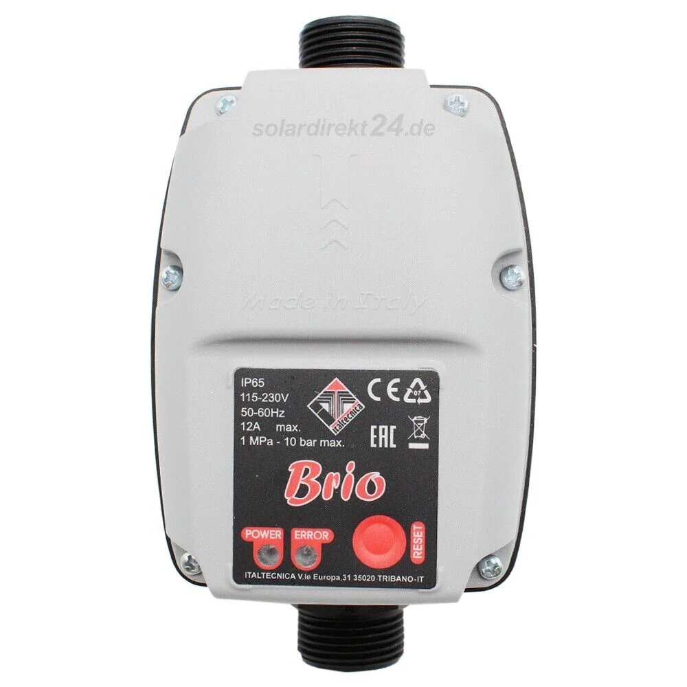 The BRIO is an adjustable pressure sensing controller with dry run protection. Designed to automate the operation of an electric pump, the BRIO has the ability to sense a drop in pressure in the system (opening a tap or valve). The pump controller will turn off the pump when the tap valve is closed and the system is re-pressurised and the flow ceases. (Starts and stops the pump with the opening and closing of the taps). The BRIO can be used in conjunction with shower pumps in installations where there is a ‘negative head’ otherwise known as ‘universal head’ (when the shower head is above the water level in the cold water storage tank), and also where the pumps are supplying several outlets at once e.g. body jets or rain bars, or domestic water supplies (toilets, taps, washing machines). The BRIO comes complete with a pressure gauge which allows the starting pressure value and system pressure to be easily checked. The unit will also protect the pump from dry running if the water supply should fail. It also has a built-in timer which will automatically try to reset itself 4 times in 60 minutes in the event of a previous shut down due to a lack of water.